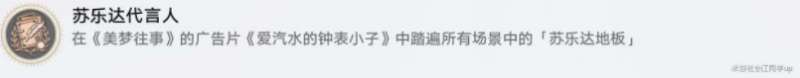 成就描述:在《美梦往事》的广告片《爱汽水的钟表小子》中踏遍所有场景中的「苏乐达地板」。
