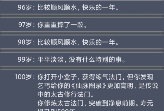 3、这条修仙路线难点在于必须领悟混沌大道,找到修仙书。不然就是500寿命终。优点是不卡数值,很容易达到双2000,死亡事件只有一个神游境夺舍。