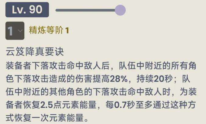 进行下落攻击时目标命中后,将提高全队中的角色下落攻击伤害,其他的角色下落攻击击中敌人时,还可以恢复装备者的元素能量。
