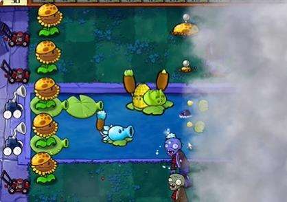 2、在左侧种一列阳光向日葵,右侧种植一列阳光地雷,在泳池中种植一个寒冰香蒲和一个玉米卷香蒲。