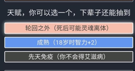 1、轮回之外这个天赋。试了快五十次,大概就是死了有概率变成魂体,年龄越大概率越小,大多是意外触发,车祸或者枪击之类,所以我点了华裔更方便。