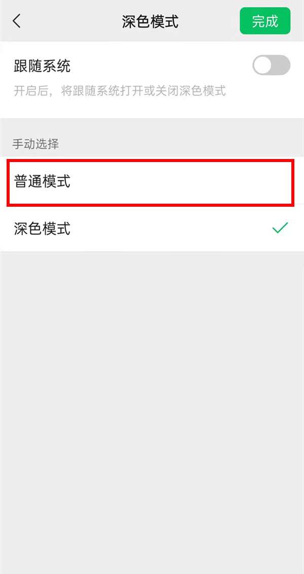4、将跟随系统右侧的按钮关闭,并勾选普通模式就可以了。
