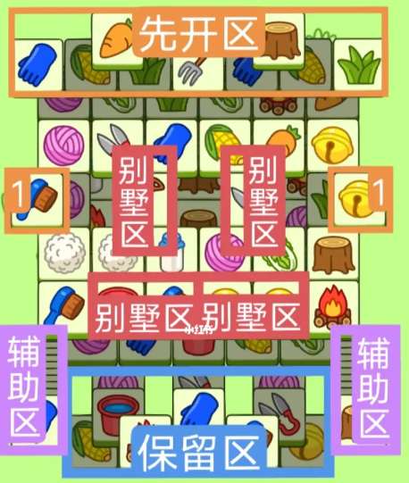 四个长形别墅。开局先消除橙色区,这里压牌比较多。然后按照一层层均习消除表面牌。让牌面保持在同一水平面上。必要时可必用首盒区辅助消除表面牌。尽量还是必别墅区内互相消除为主。蓝色区有叠牌,但是不多,全部保留到后期使用。