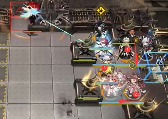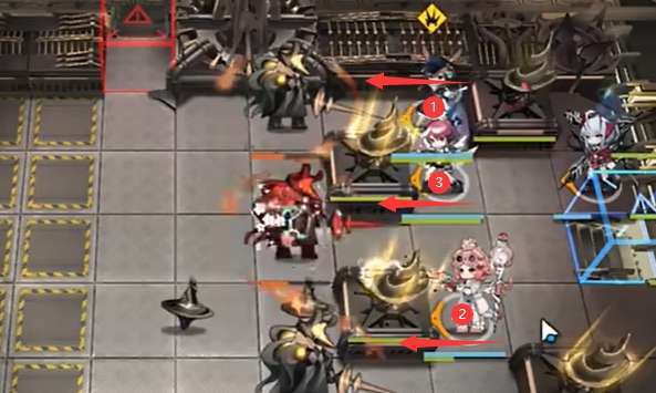 如图所示开局部署【①阿米娅】【②澄闪】【③能天使】向左。