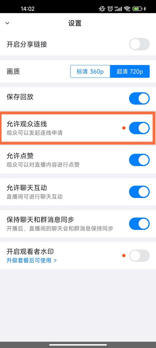 3、打开允许观众连线功能即可。