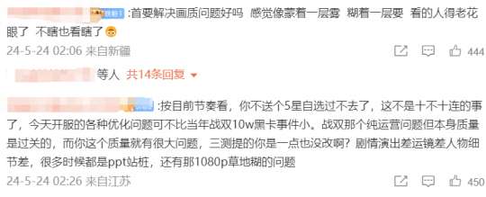 对此,很多玩家都表示除了游戏性能优化有问题以外,在质量上还存在不少的硬伤:“剧情演出差、运镜差、人物细节差,很多时候都是ppt站桩”,“剧情真的又臭又长,就老老实实突出你拿手的战斗就行”,“人物塑造太差劲了!炽霞和凌阳,一个太热情非常不自然,一个过于鸡汤中二,这两人简直尬死了”……