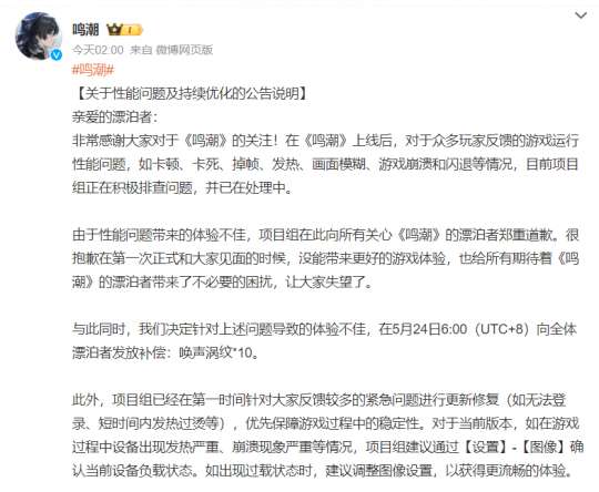 面对这个情况,《鸣潮》项目组也没睡好觉,连夜发布了一个公告,先针对影响玩家体验的游戏性能问题进行了道歉,称项目组正在紧急排查中,先给大家送一波十连抽以表达歉意。