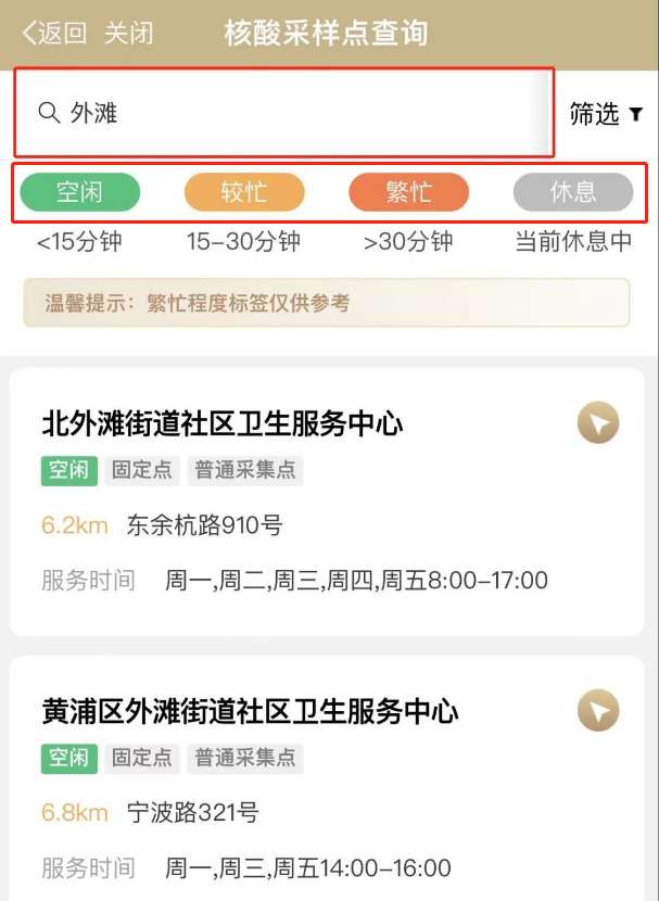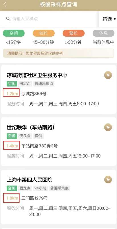 4、或者大家也能点击上方输入位置进行搜索,针对结果大家可以根据下方的空闲、较忙等进行筛选。