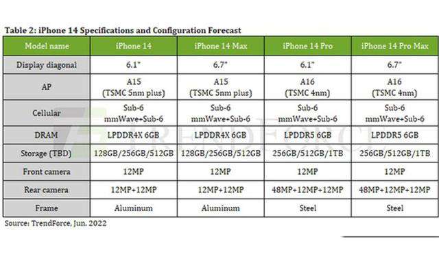 与前代最大的升级就是,这四款机型全系标配了6GB内存,不过基础版的iPhone 14和iPhone 14 Max则采用的是LPDDR4X规格内存,而iPhone 14 Pro与iPhone 14 Pro Max采用的是LPDDR5规格内存。