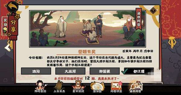 1、6.24题目:农历6月24日是神保观神生日,这个节日在古代颇为盛大,主要是为纪念秦蜀郡太守李冰父子,他们在任时,曾经大修水利工程,事到如今该水利工程仍然发挥着作用,这个水利工程便是?
