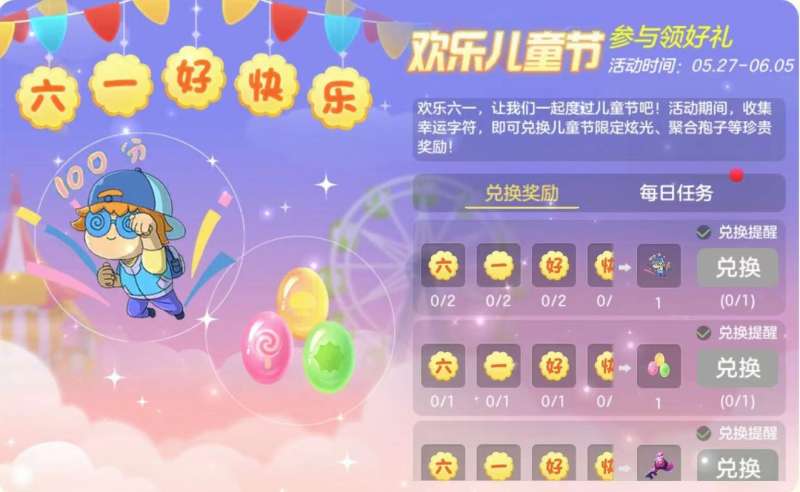 活动内容没有礼物的六一儿童节是不完整的,快来完成任务收集幸运字符兑换儿童节专属礼物吧,限定炫光、聚合孢子等你来拿!