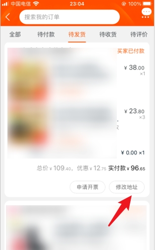 6、如果商家开通了修改地址服务,那么在对应订单上点击“修改地址”。