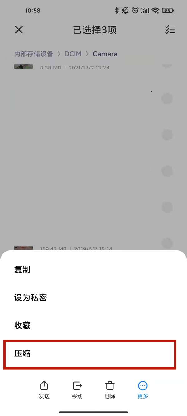 3、长按照片,勾选需要打包的照片,点击更多,再点击压缩。