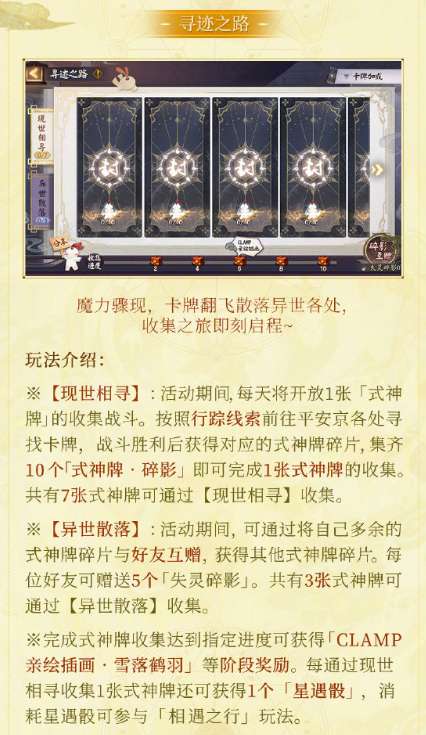 ※完成式神牌收集达到指定进度可获得「CLAMP亲绘插画·雪落鹤羽」等阶段奖励。每通过现世相寻收集1张式神牌还可获得1个「星遇骰」,消耗星遇骰可参与「相遇之行」玩法。