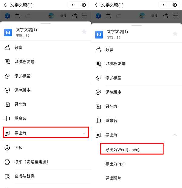 2、找到【导出为】,然后选择【导出为word(.docx)】即可。