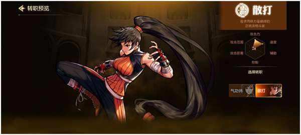 轻甲物理职业,技能属于瞬间爆发类,能在短时间打出大量输出,但是散打这个职业需要一定的操作,技能范围都比较小,要跟怪物近身搏斗;策划也是了解到散打的弊端,特意给散打金刚碎进行了升级,不需要有前段的跳跃了,直接攻击地面,并将怪物浮空聚集在自身面前。
