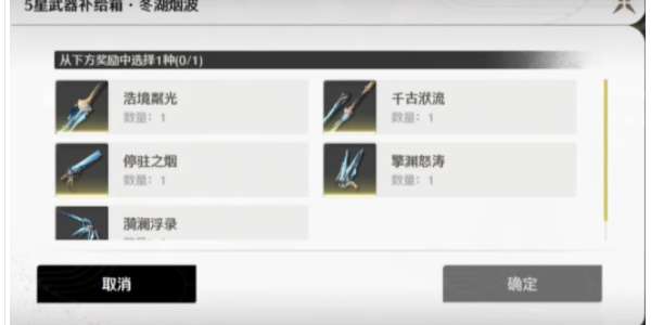 3.「5星武器补给箱」获取方式:漂泊者还可在联觉等级45级时,在常驻活动「初醒之征程」中领取到「5星武器补给箱·冬湖烟波」,在补给箱中漂泊者可任选一把武器领取。