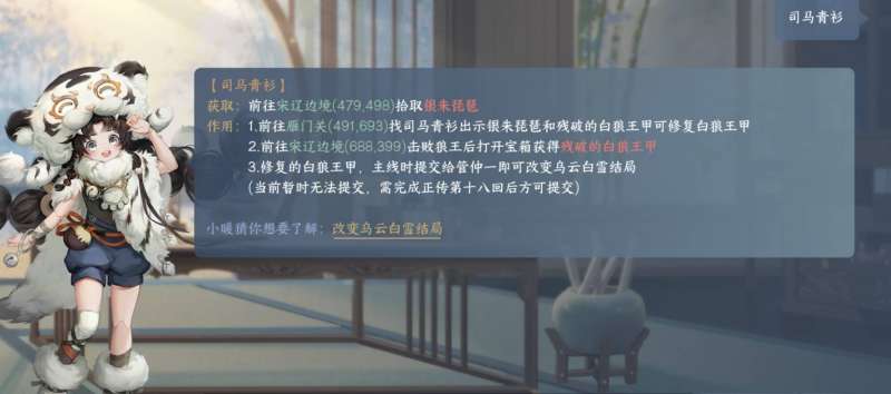 前往雁门关(491,693)找司马青衫出示银朱琵琶和残破的白狼王甲可修复白狼王甲。