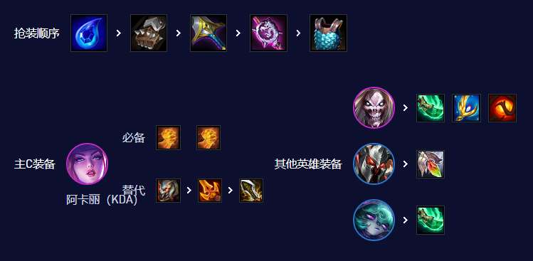 优先阿卡丽和死歌的神装,然后根据剩余装备来分配,有多余的法强装备就给薇古丝,多余的肉装备就给铁男。