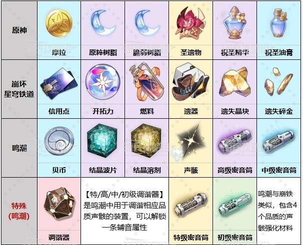鸣潮、原神以及崩坏星穹铁道在玩法上会有些类似,这也是之前引起过很多争议的,鸣潮上线之后玩家想要知道游戏中的道具和其他两款游戏的道具有什么不同,具体的道具对比图游戏鸟小编这就分享在下面让大家更好的了解。