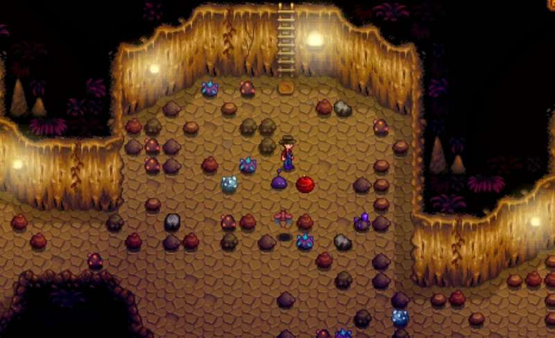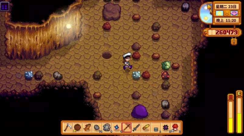 满足这两个条件之后,玩家便可以乘坐巴士来到沙漠当中,用钥匙打开头骨山洞的大门。头骨山洞的基本构造与鹈鹕镇差不多,只不过有了许多游荡的怪物。每来到一层,玩家都需要挖出一条前往下一层地图的梯子,在这期间,还需要收集附近的道具,并击杀游荡的怪物。成功完成一层的挑战任务之后,就可以与梯子进行交互,选择跳进去即可。如果觉得利用稿子向下比较慢,也可以提前准备好大量的炸弹,直接用炸弹快速清理障碍物,这样每一层的探索时间就会大大减少,可以帮助我们快速接近目标。只要提前准备好大量的铱石,就可以与沙漠商人交易获得大量的炸弹,满足我们的探险需要。在前往的时候,尽量保证背包的空旷,不然一旦死亡,会损失大量的资源和装备。