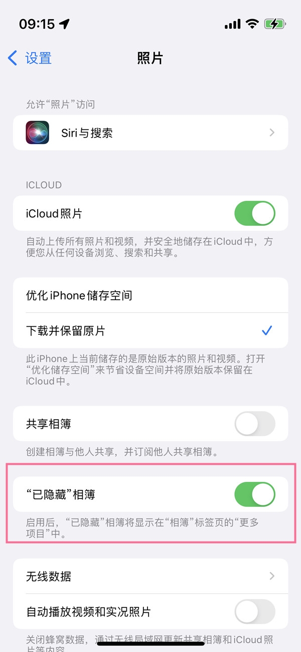 2、关闭【“已隐藏”相簿】右侧的开关。