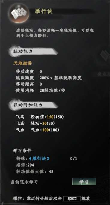 学习条件:雁行诀秘籍*1,感悟294,轻功值最大值45