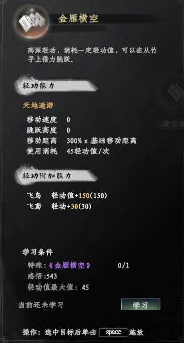 学习条件:金雁横空秘籍*1,感悟543,轻功值最大值45