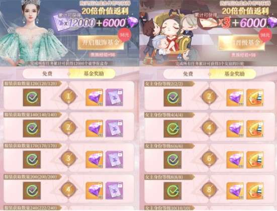 第一个,氪金必选之——特权卡。特权卡有25块的月卡和198的终身卡。月卡是必须购买!喂猫、游历、派对收取等都会感受到一键的快乐,买完马上就能领250钻石,还能去领限时充值的奖励。(这里说一下,限时充值里每日充值的奖励有个美食系列的参与道具,第一期是火锅,参与完记得去背包的活动道具里使用,加的影响力还挺多的)。月卡每天还能领100钻,算下来一个月就有3k钻这样,比钻石充值性价比高挺多。如果不买其他的随便充个6元就能到VIP1还能拿套衣服,领VIP礼包,里面的资质券我看基本都是冲榜奖励的稀有物,感觉还行。