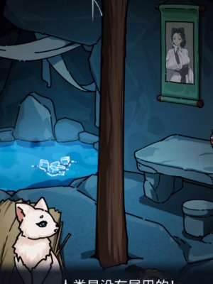 3、接着我们把狐狸放到水池,用剪刀剪蜘蛛网制作成衣服给她穿上,拖动画像上的脸给小狐狸,这关就通关了。