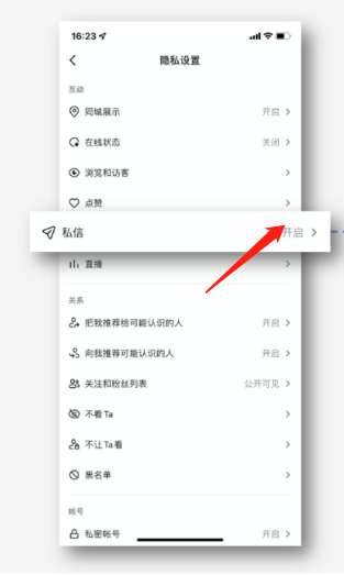 1、打开软件中的设置,在隐私设置中点击【私信】。