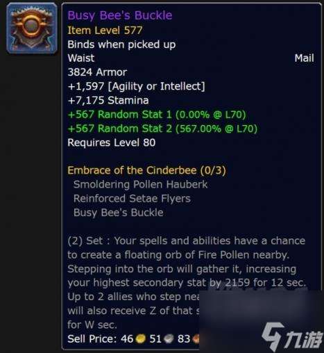 (2)套装:你的法术和能力将有几率在附近产生一团漂浮的火焰花粉。踏入会获得花粉,使你的最高副属性提高2159点,持续12秒。这段时间内,你附近至多2名盟友也会获得Z点属性,持续W秒。
