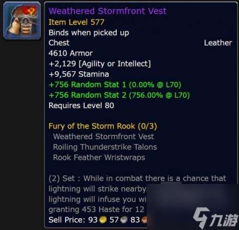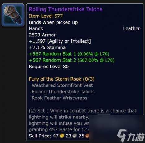 (2)套装:战斗状态下,附近将有几率被闪电击中。玩家被闪电击中时,你将获得雷鸫之怒,获得453点急速,持续12s。