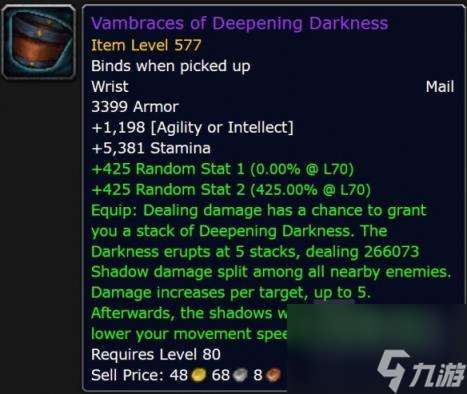 装备:造成伤害时有几率为你叠加一层深化黑暗。黑暗在叠加到 5 层时爆发,造成 266073 点暗影伤害,分摊给附近的所有敌人。每个目标都会使伤害增加,最多 5 次。之后,阴影会拖慢你的脚步,降低你 25% 的移动速度,持续 5 秒。