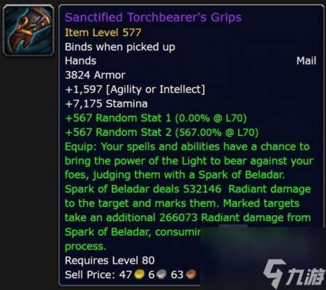 装备:你的法术和能力有几率将圣光之力用于对付你的敌人,用贝拉达尔的火花审判他们。贝拉达尔的火花会对目标造成 532146 光耀伤害并标记他们。被标记的目标会受到贝拉达尔的火花的额外 266073 光耀伤害,并在此过程中消耗火花。