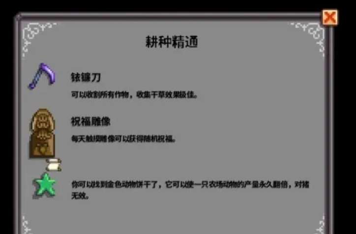 能量祝福会被赋予无限的能量,基本上获得精通之后,能量也没太大作用了;獠牙祝福会增加百分之十的暴击率,有侦察员可以增加百分之十五,如果叠加匕首或者暴击剑的话战斗会更爽;友谊祝福会让玩家在与游戏中的角色交谈时获得更多的友谊,有了这个比送礼物都要加得好感度多;速度祝福能增加0.5的速度;水之祝福会让今天钓的前三条鱼更容易。这个可以拿去一些难钓的鱼,或者做钓鱼任务。钓鱼十级再加水之祝福,能让钓章鱼都变得简单很多,如果用双软木塞可以轻松掉三条铱星鱼王。还有一点的幸运祝福,聊胜于无吧。