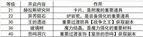 21级开启的赫拉斯研究所就可以入手这个卡片,22级开启的异界陨石就可以入手炉岩炭,30级开启的王的遗迹就可以入手【战争之王】系列防具,36开启的玻璃树就可以入手魔力结晶,40级开启的悲鸣洞穴就可以入手【窒息的悲鸣】系列首饰。