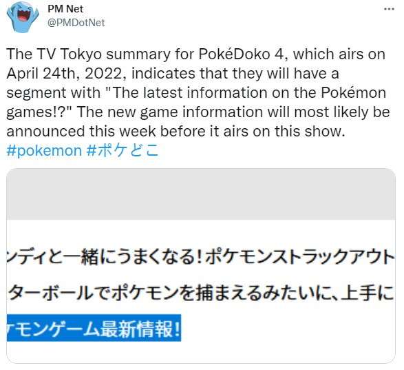 关于《宝可梦:朱/紫》的新消息一直很少,近日专注《宝可梦》系列情报的网友PM Net在推特上发文称,日本大阪电视台的综艺节目PokéDoko最新一期将于北京时间4月24日播出,将分享“宝可梦游戏的新情报”。有媒体认为这款宝可梦游戏可能是《宝可梦:朱/紫》,
