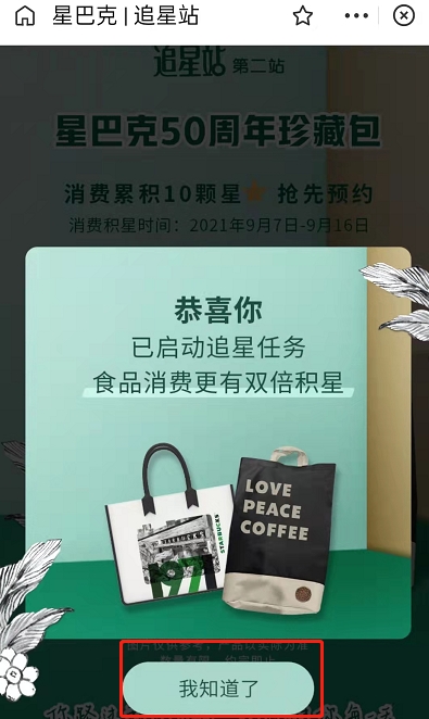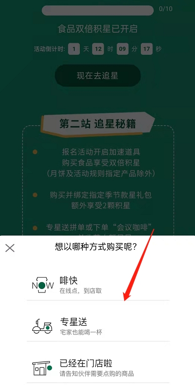 5、我们选择任意方式购买星巴克,就能够获取积星,购买指定食品可以获得双倍积星,获得足够积星后就可以兑换收藏包啦。