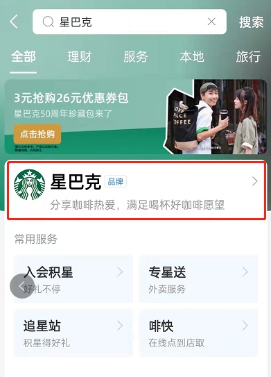 1、打开支付宝,搜索星巴克,点击进入主页。