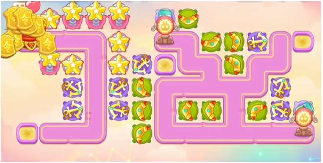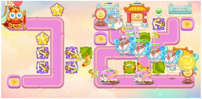 4、右边买回旋镖和船锚打钱袋,打完钱袋空出位置建立回旋镖和船锚都可以,继续清理右边障碍物,萝卜附近防空星星在建立一个。