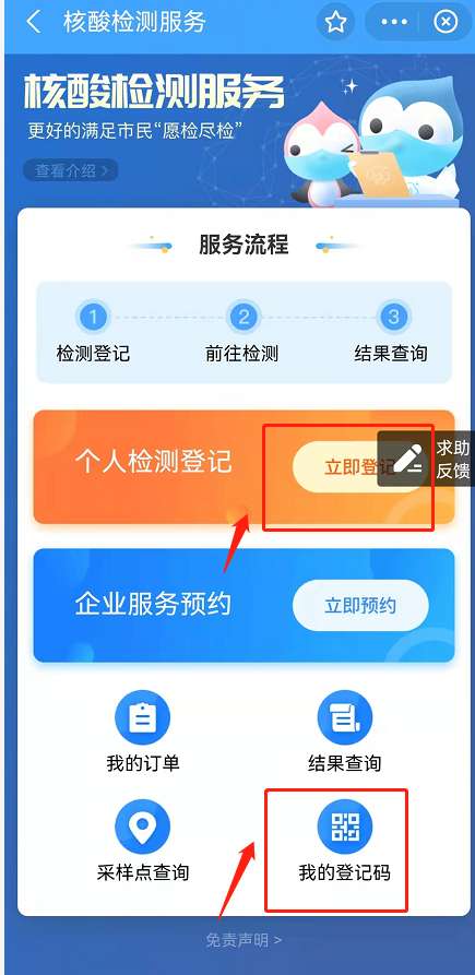 3、最后点击个人检测登记或者我的登记码,根据步骤输入个人信息就能查看采样登记码了。