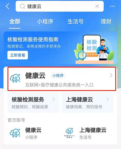1、打开支付宝点击上方搜索框输入健康云,点击下方框中的小程序进入。