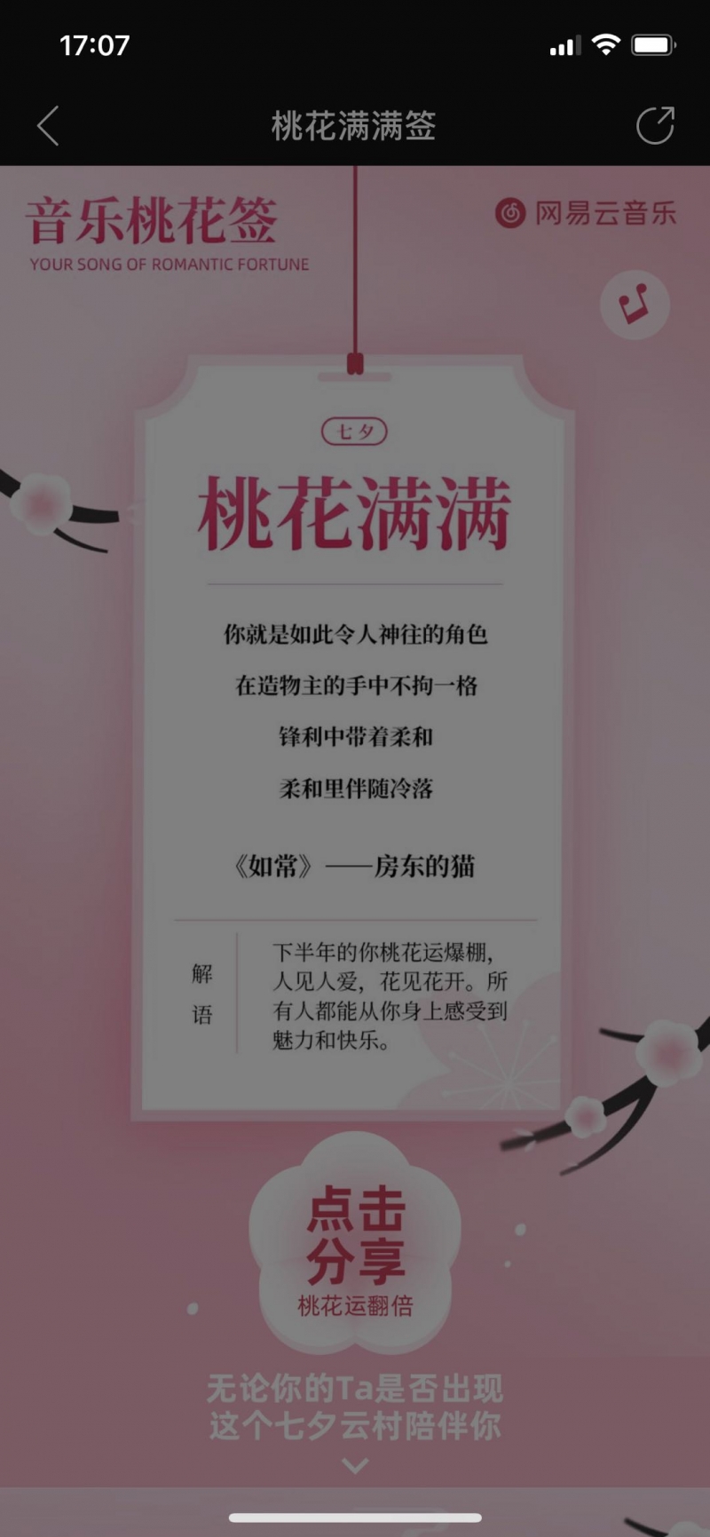 网易云音乐桃花签测试:是网易云为七夕节日专属推出的活动,在线上可以帮助每一个用户小伙伴们测试推送自己的桃花运,查看自己的脱单几率,非常有趣,有兴趣的小伙伴们赶紧来下载网易云音乐测试自己的桃花签吧!
