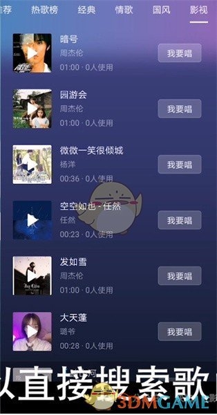 3、歌曲有六大类型,用户可以按类型选择歌曲,也可以直接搜索歌曲名称,再进行k歌。选择好心仪的歌曲后,再点击我要唱;