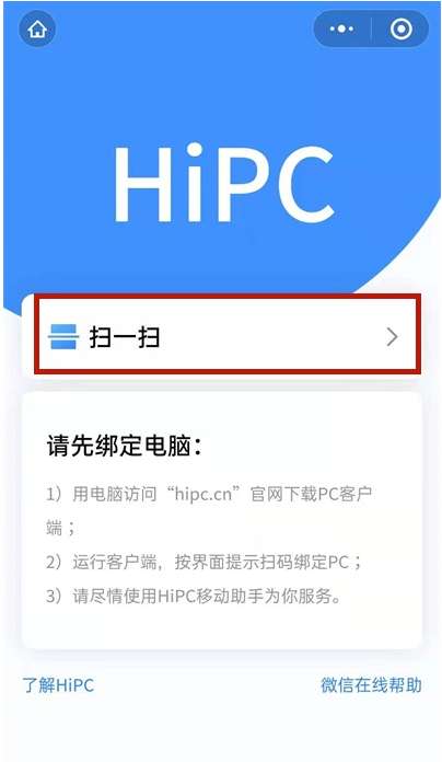 2、找到扫一扫,扫描电脑上的HiPC客户端完成绑定即可。
