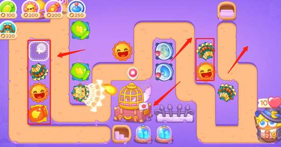 1、首先我们把瓶子炮都升到二级,然后使用下面的瓶子炮打掉魔法帽,最后带护甲的兔子我们需要让两个炮塔一起攻击。