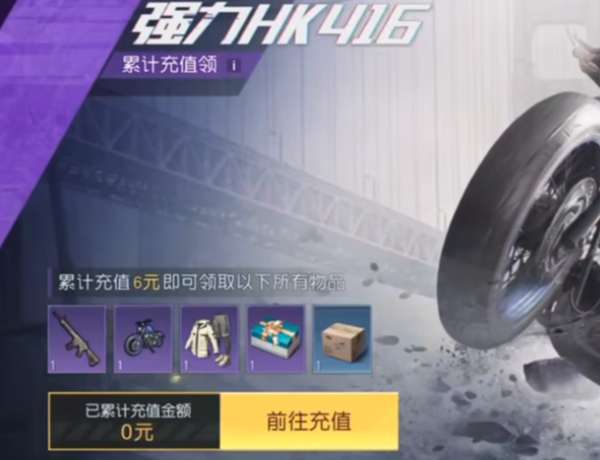 1、首充5元就能领取五件物资,分别是:hk416步枪,载具摩托、装扮衣服、绷带、生存礼包。