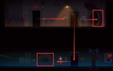 2、接通电流后,先激活下图1处的控制台将升降台升起,然后转动2处的阀门开启水流,最后在通过E-3门可以获得遗落的机器人笔记。
