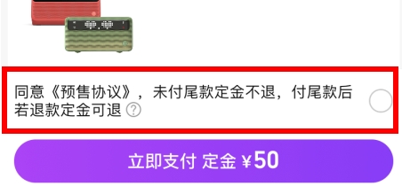 我们在购买预售商品付定金的时候,下面的相关协议就已经很明确的说明了,根据预售商品规则,如果您只付了定金,但是没有如期支付尾款,那么是不支持退定金的哦。在您支付尾款后,如果订单退款,那么定金和尾款是全额退回的哦~